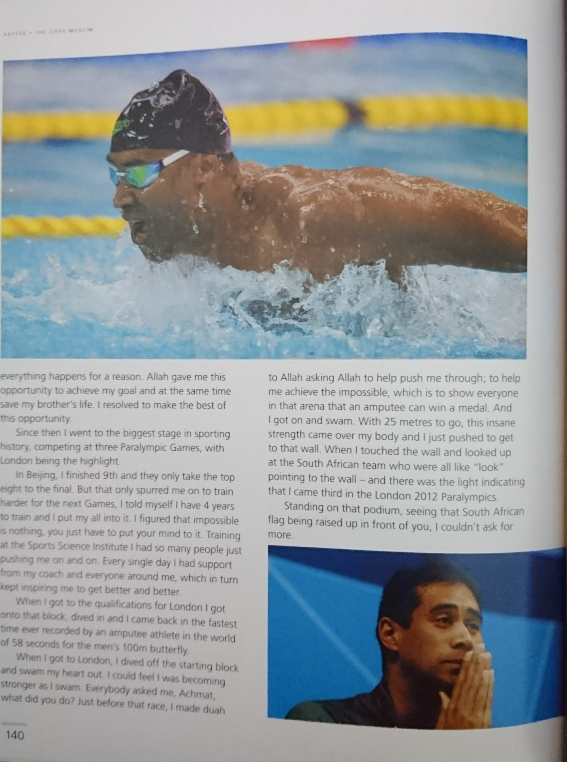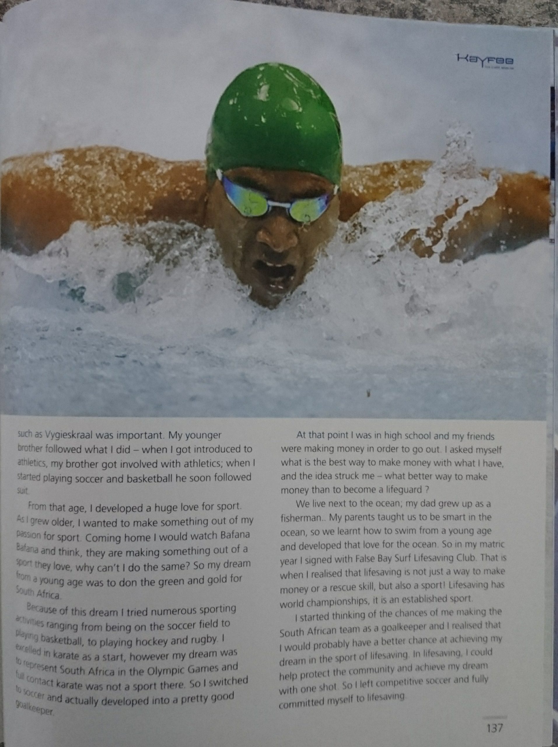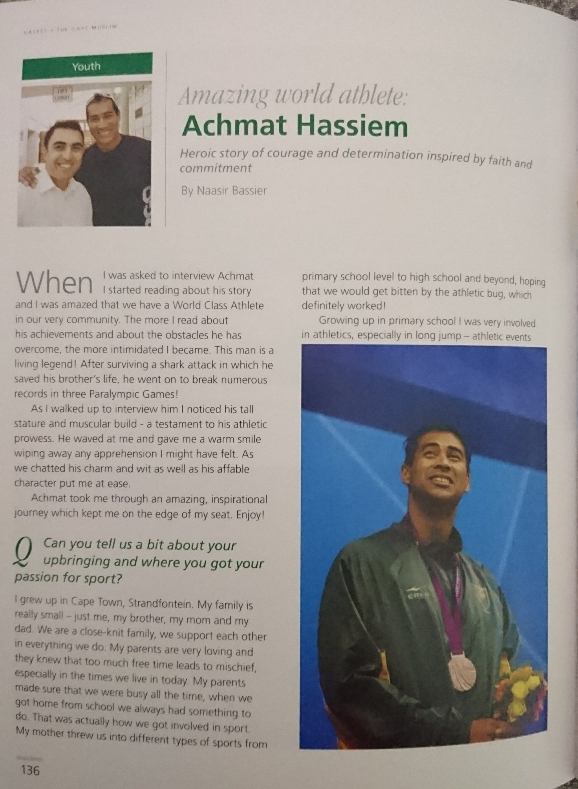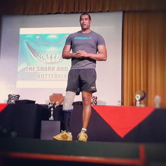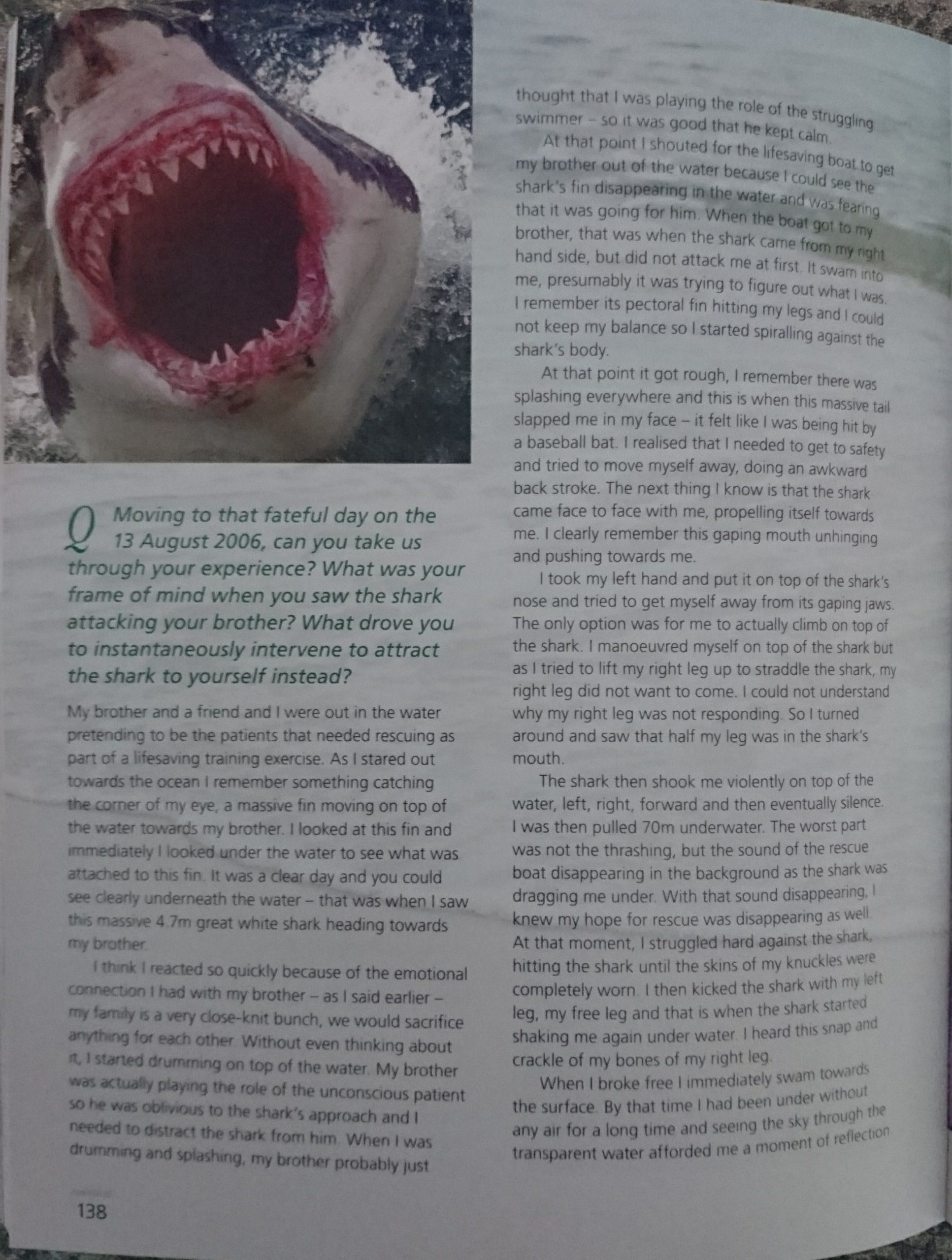 The 4.7m shark bit him and started dragging him down into the ocean by his leg. With his air gone he came to the realization that he was not ready to die – ie. a state of Nirvana or Zen mind. He then clambered onto the shark which broke his leg off, started punching the shark on the nose and only by pushing his hand into a scar and wiggling it which enraged the shark that then shook him off. He quickly swam to the surface and luckily a rescue boat reached them at this point in time and could get him out before the enraged shark who had returned could and Achmat was rushed to hospital and operated on. His bravery in drawing the shark towards himself then evolved into another kind of bravery, the bravery of not letting his handicap dictate the remainder of his life.
